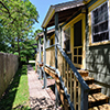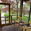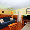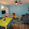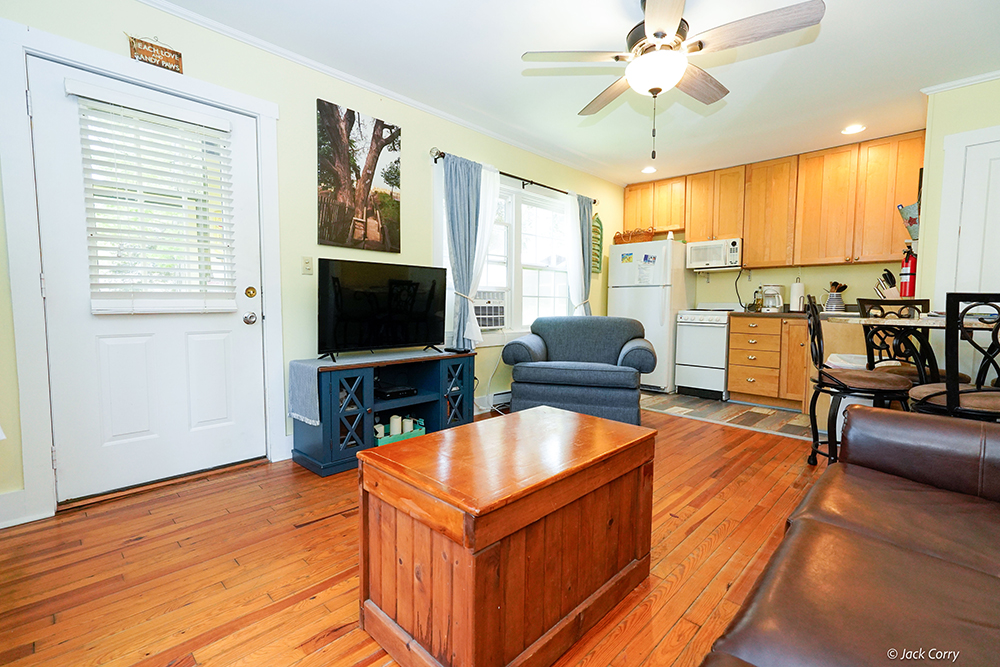 This delightful cottage has a full bed, trundle bed with 2 twin mattresses, queen sleeper sofa, wood floors, screened in front and back porches (back porch has a ceiling fan), window A/C unit in living room, ceiling fans in all rooms including bathroom, built-in breakfast bar, 2 TVs, expanded cable, DVD/VCR combo, CD player, dishwasher, microwave, blender, toaster, coffee maker, and front steps hand rail.