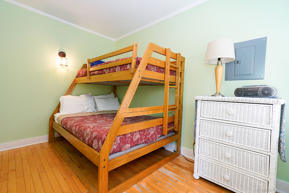 This gracious cottage has a fireplace, window A/C unit, 1 full bed, 1 twin over a full bunk bed, wood floors, screened in front porch, flat screen TV, cable, VCR, DVD, CD, microwave, blender, and coffee maker, and dishwasher. A skylight on the living room and a kitchen island add a pleasant ambiance.